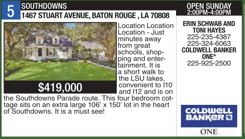 OPEN SUNDAY 2:00PM-4:00PM ERIN SCHWAB AND TONI HAYES 225-235-4387 225-324-6063 COLDWELL BANKER ONE* 225-925-2500