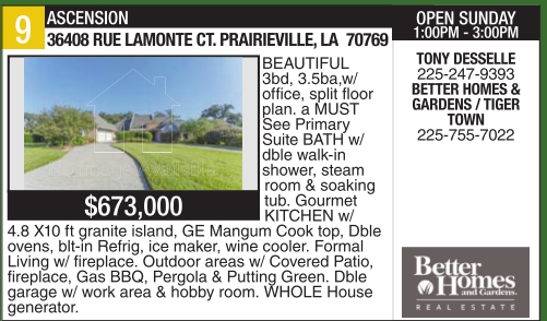 36408 RUE LAMONTE CT. PRAIRIEVILLE, LA 70769 $673,000 BEAUTIFUL 3bd, 3.5ba,w/office, split floor plan. a MUST See Primary Suite BATH w/dble walk-in shower, steam room & soaking tub. Gourmet KITCHEN w/4.8 X10 ft granite island, GE Mangum Cook top, Dble ovens, blt-in Refrig, ice maker, wine cooler. Formal Living w/fireplace. Outdoor areas w/ Covered Patio, fireplace, Gas BBQ, Pergola & Putting Green. Dble garage w/work area & hobby room. WHOLE House generator.