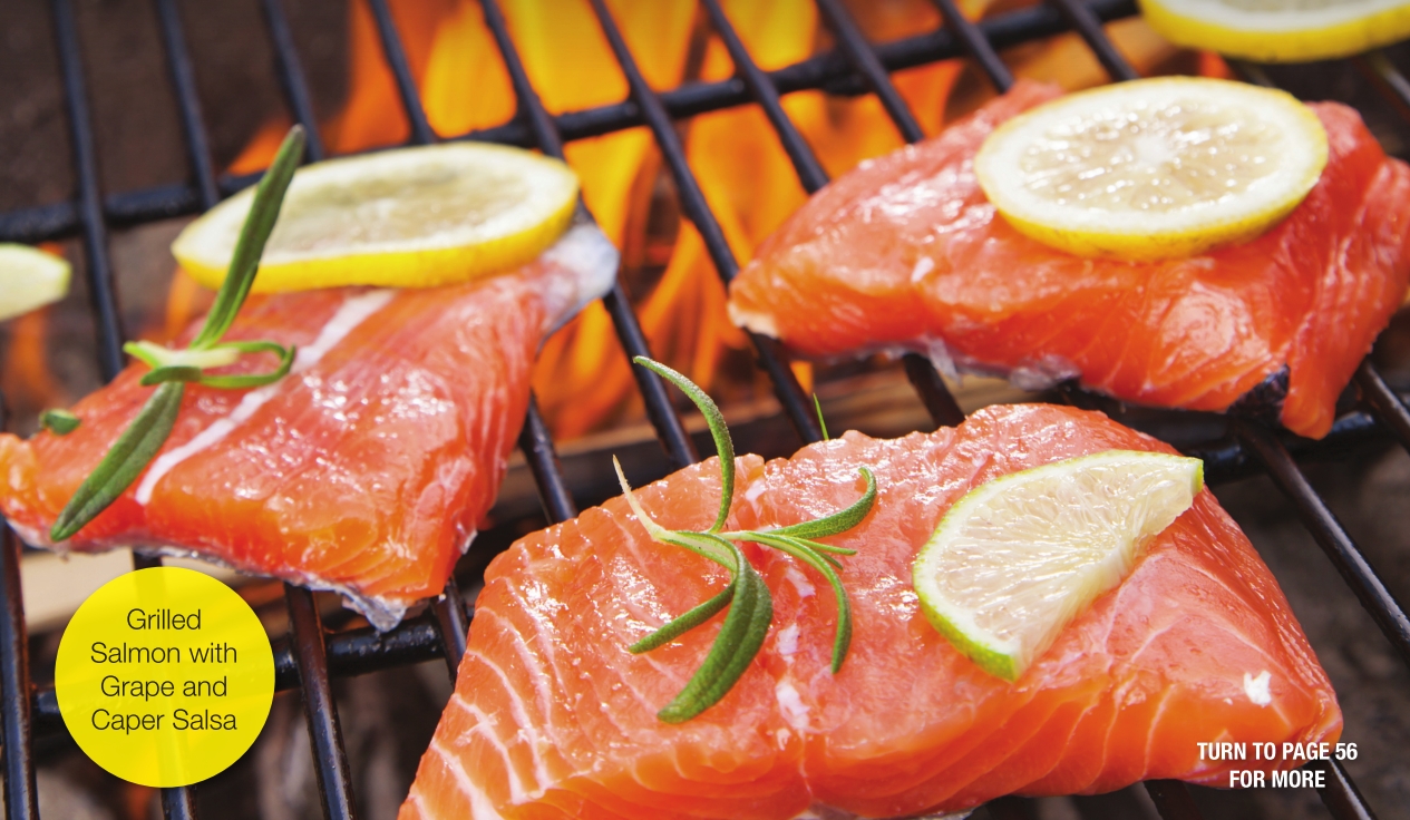 Cook salmon on preheated grill until cooked to desired degree of doneness, one to three minutes per side for medium-rare. Spoon the grape and caper salsa over the lower third of each steak. Serves 4.