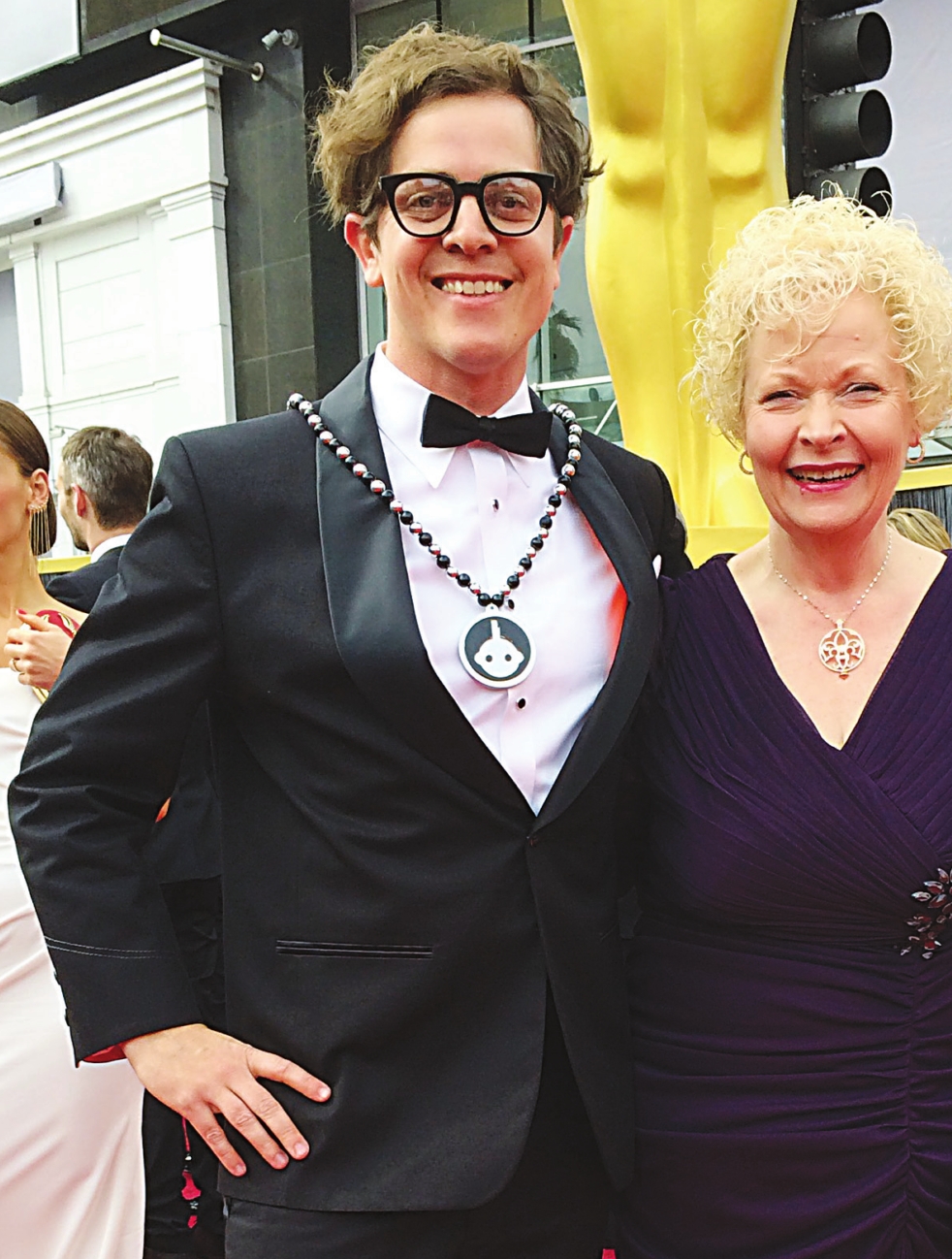 Sharing the spotlight with mom Brandon Oldenburg, creative partner at Moonbot Studios, and his mom, Martha Oldenburg, attended the Oscars this year. Martha is wearing beautiful jewelry from Sid Potts, and Brandon’s special Mardi Gras beads are available in Moontbot Studios’ online store: http://store.moonbotstudios. See also