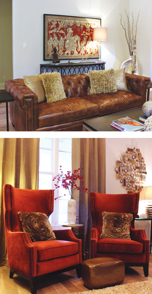 The burnt orange instantly became our pop color and is repeated in pillows, accessories and one of my all time favorite finds, a huge kalamkari. This is a hand-drawn and painted on fabric work of art from India discovered at, The Attic, an upscale consignment shop. It is rumored to have previously been owned by a local, world-renowned neurosurgeon. This one-of-a-kind piece rests over a distressed metal console from Ashley Furniture with a modern metal lamp from Briggs & Co. The perfectly square, hammered bronze/ wood coffee table from La-Z-Boy nestles into an amazingly soft and deeply piled rug from Haverty’s.