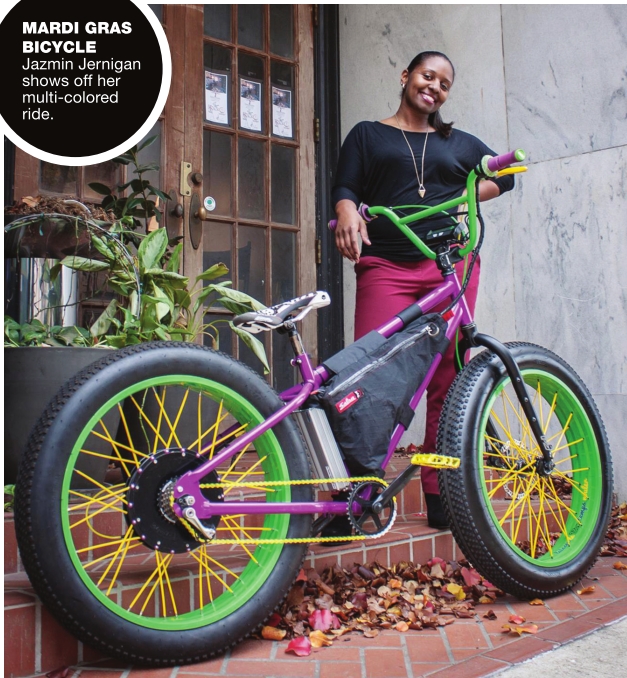 What’s it like to ride an e-bike? “It’s exactly the same as riding a regular bike,” she said. “The tires on the Mardi Gras bike are much fatter, so there’s more stability to it. But you get just as much as a workout.”