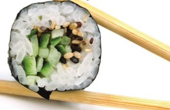 DIRECTIONS Place the sushi mat in front of you on an open work space. Lay a sheet of nori shiny-side down and lined up with the closest edge of the mat. Moisten fingers with water, and evenly press about 1/4 of the rice onto the nori. Leave approximately 1-1/2-inches of the nori uncovered at the back edge. Line up the fillings about 1 inch from the closest near edge, evenly across the rice. Leave 1 inch of rice uncovered at the far edge. Beginning with the edge of the mat nearest to you, tightly roll up the nori, rice and fillings into a cylinder. Tuck the roll tightly by pulling the mat over the roll, then pull on the far edge of the mat while controlling the top edge to tighten the roll. Open the mat, dab unsealed edge of nori with a bit of water and roll the sushi forward to seal. Transfer the sushi to a plate and cover with damp paper cloth. Repeat with half of the remaining rice and vegetable fillings, reserving the other half of rice for the next recipe. Cut each sushi roll, crosswise, into 8 pieces with a sharp wet knife. Serve with soy sauce for dipping.