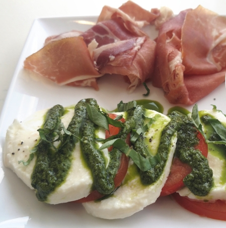 That’s unless I order a piadina flatbread sandwich. Meatball or the Quatro Formaggi Panino would be great to share. How could I resist four kinds of cheese, like hot melty mozzarella, asiago, Cambozola and Grana Padano with a side of pomodoro tomato sauce? Prosciutto Panino with prosciutto, mozzarella, arugula, Granda Padano, sliced tomato, basil pesto cream sounds like a yummy, toasted version of my favorite salad. Speaking of caprese salad, and I was, the PastaCaffe plates lovely layers of ripe tomato slices, mozzarella and basil cream with a side of prosciutto.