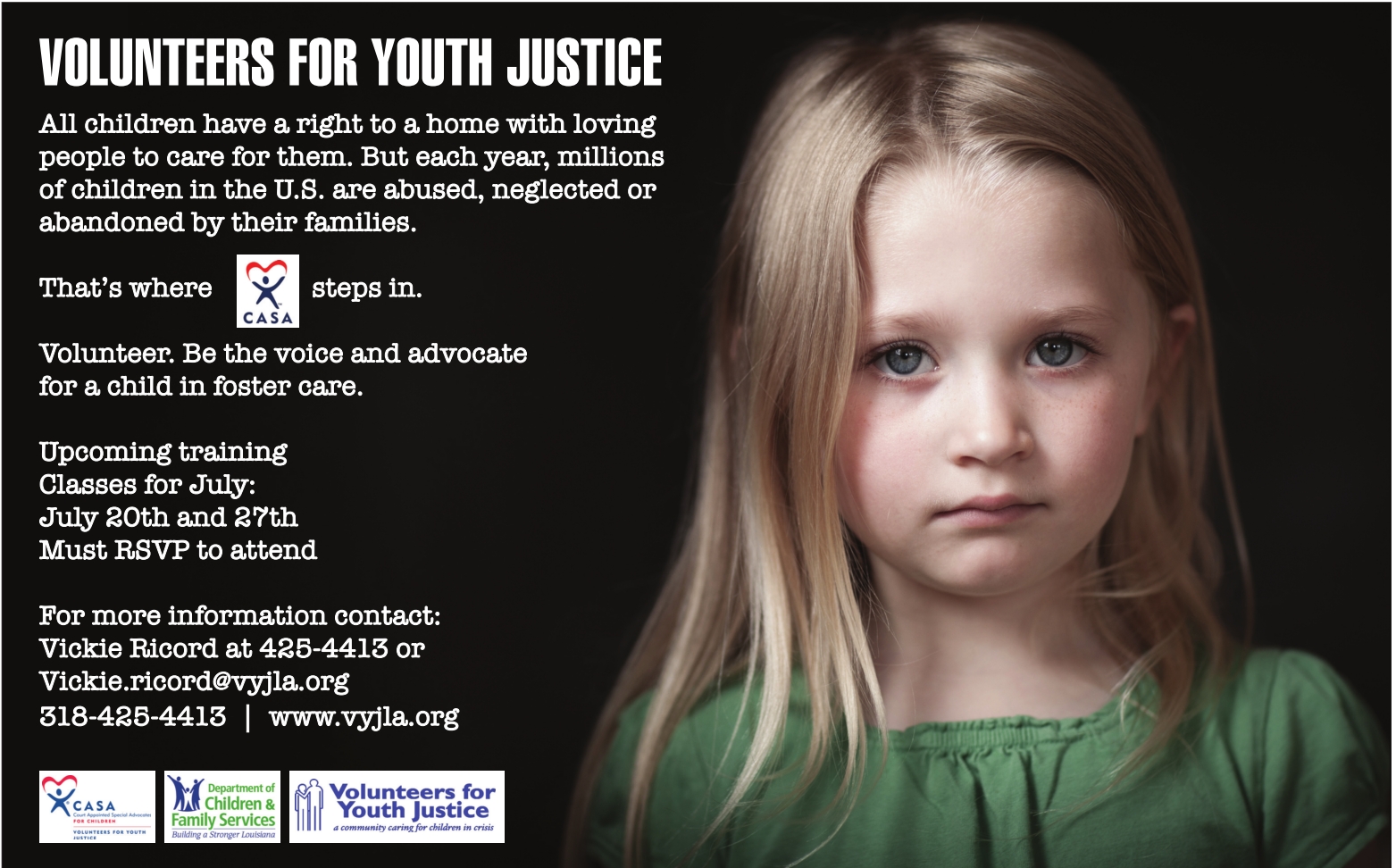 VOLUNTEERS FOR YOUTH JUSTICE All children have a right to a home with loving people to care for them. But each year, millions of children in the U.S. are abused, neglected or abandoned by their families. That’s where steps in. Volunteer. Be the voice and advocate for a child in foster care. Upcoming training Classes for July: July 20th and 27th Must RSVP to attend For more information contact: Vickie Ricord at 425-4413 or [email protected] 318-425-4413 | www.vyjla.org