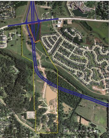Included here is an aerial photograph taken a few weeks ago of the development and surrounding area. Outlined in red is the 16-plus acre tract owned by Shreveport taxpayers, outlined in yellow is Larkin’s land, and the double, bolded purple lines are Highway 3132. The diamond interchange with Highway 3132 and Flournoy-Lucas Road (LA Highway 523) is shown at the top of the image, with the proposed southerly extension of 3132, proceeding across Bayou Pierre, shown as it swings toward the Port. Clearly, the Highway 3132 Extension would run through a sizable portion of Larkin’s development. Regardless, construction of the development is clearly visible.