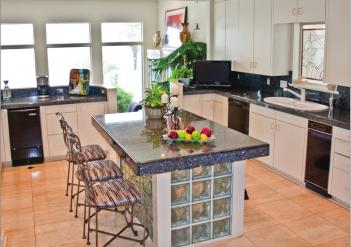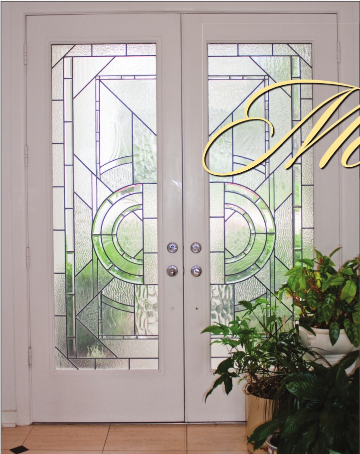 It’s not only a watery view that gives a Greek feel to the home, but the shape of the architecture within. Built in the 1980s, those rounded corners, multiple levels and clean white details remind one of whitewashed domed manses tumbling down the sides of Greek Islands. On street level, Gary’s of ce, a powder room and the kitchen reside. The granite chosen by Tina for the kitchen at Berry’s Quality Tile is made for this particular home, evoking that Aegean Sea blue in mica- lled ecks amidst the other darks and lights of the stone look almost like waves. A massive island of it is carried on the backs of glass blocks and provides seating for three. A commissioned leaded glass window does not match the front door, but compliments it in iridescent shapes, made by an artist they met at the Red River Revel.