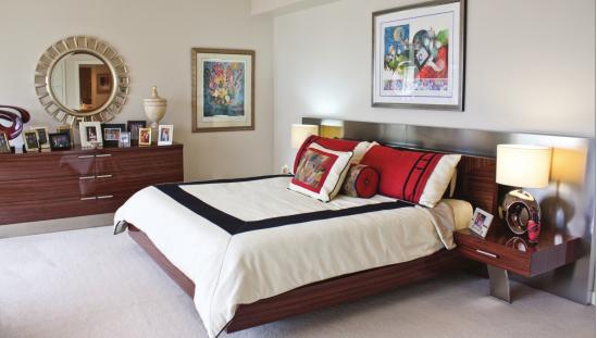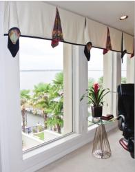 The master bedroom is so high above the steep lot that it is almost like being on a cruise ship. The window treatments are merely sculptural valances to allow the view to take center stage. They are mostly invisible except for a folded presentation of a print material around a black and white button – a simple accompaniment to the bedding designed for Tina by Ethan Allen. The bed oats on a platform that also shares adjoining night tables, all in a treatment that mimics zebra wood.