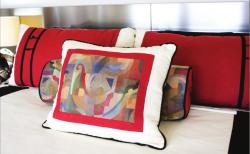 In those, interest is done with textures, adding a richness to a basic palette. It all sits on a modern rug, lled with blocks of color and trimmed in a thick black outline. Stone appears in table bases, and columns anking the doors to the outside. Each is topped with a large urn holding greenery, framing the view in classical adornment. These remind on-lookers of buildings of Greek antiquity; there’s a bit of Acropolis here and there.