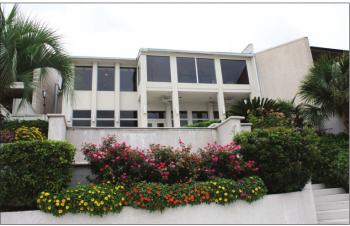 Up nearly-nautical stairs with fat tubular rails, the upper story extends toward the street over the garage, and houses three bedrooms, a study, and four baths. It is here that you feel the more than 4,000 square feet of the plan.