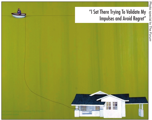 “I Sat There Trying To Validate My Impulses and Avoid Regret” depicts a simple stark white house against a rich green backdrop. The house in the lower right corner is connected to a boat with a long thin thread in the upper left corner. Looking out from a window of the house a recognizable man with a beard and thick rim glasses (a self-portrait of Chambers) once again stands next to a chimpanzee wearing a bright orange life vest smoking a cigarette. In the boat Leigh Anne sits with her dark hair and a forlorn expression. It is beside the point that some viewers may recognize these portraits as they capture the universal theme of misunderstanding between two people. It is an optimistic and hopeful work in that the gures remain connected by a thread and the text honestly and humorously acknowledges our potential for human folly.