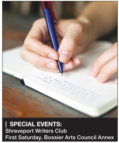 FIRST SATURDAY OF THE MONTH: SHREVEPORT WRITERS CLUB, Writers from all stages of life in all genres and styles of writing meet to share their thoughts in written form with other people who love words; guests welcome. Free. 10:30 a.m. to 12:30 p.m. Bossier Arts Council Annex, 630 Barksdale Blvd., Bossier City.