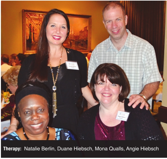 Therapy: The Center for Families presented Wine, Cheese and Therapies, an event held on Nov. 2 at Guiseppe’s. Guests experienced therapy as a way of living and a four-course meal that included gourmet mini pizzas and cheese beignets, mushroom ravioli, chicken breast layered with ham, Swiss cheese, sage and wine sauce, and pumpkin panna cotta topped with vanilla hazelnut sauce. Color therapy was at each diner’s seat. They used crayons to say what the center’s logo meant to them and winners received Guiseppe gift certifi cates. Mint water after dinner served as hydrotherapy. Appetizers considered aphrodisiacs served as love therapy, along with kissing therapy from love goddesses. Other activities included ear massages for touch therapy, laughter therapy, photo therapy and jewelry therapy. Music therapy included a harpist and the River Cities Jubilee Chorus. Outdoors, there was even thrill therapy for those who wanted to ride a mechanical bull. The silent auction was called green therapy. Lee Michaels offered a $2,000 shopping spree in a raffle.