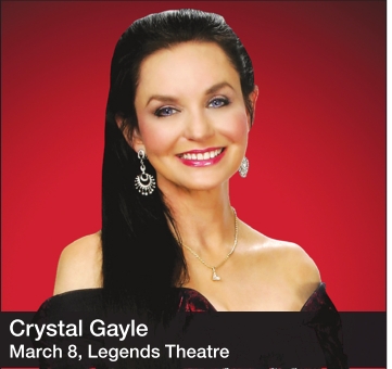 MARCH 8: CRYSTAL GAYLE, The country music singer is best known for her 1977 country-pop crossover hit “Don’t It Make My Brown Eyes Blue.” Prices start at $25. 8 p.m. Legends Theatre. Call 678-7695.
