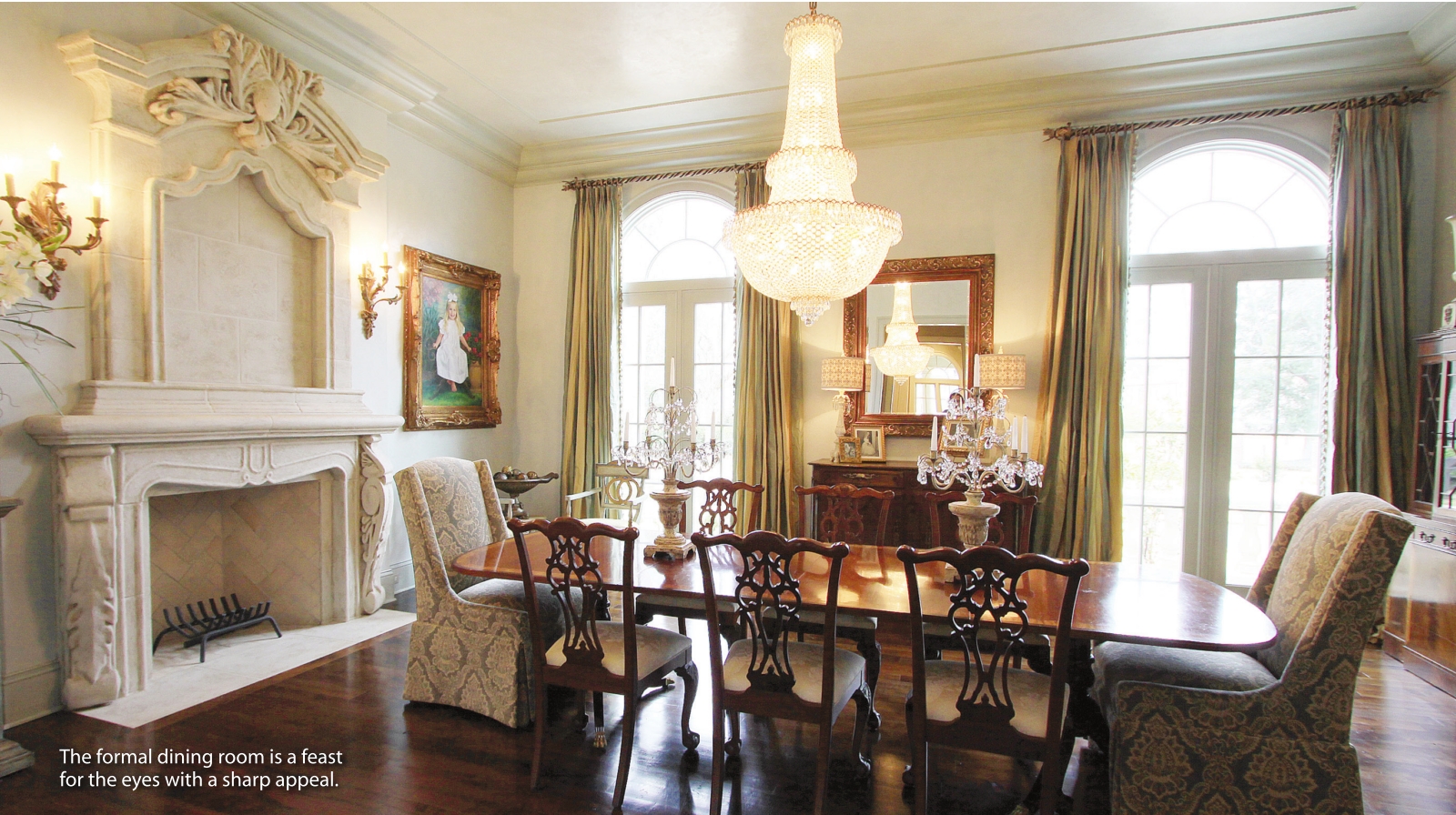 A formal dining room and living room flank the dramatic entryway. In each, two stunning oil portraits by Vicky Popwell of the children brightly gleam from the walls, combining with the subtle greens and golds treated individually in each room. The frames are of Rococo design, very elaborate, gilded and formal. For dining, the Ghalis gather around a mahogany table that belonged to Ghali before he was married. The chandelier, which lights the room, was a gift from his parents and was used at his and Hope’s wedding at Shreveport Country Club years ago and now lights formal meals. The living room seems almost English with its quiet elegance. Although there are many carved pieces and soft floral fabrics, the room is not overpowering due to the clean lines of the simple bronze lighting fixtures with just a simple “necklace” of crystals draping them.