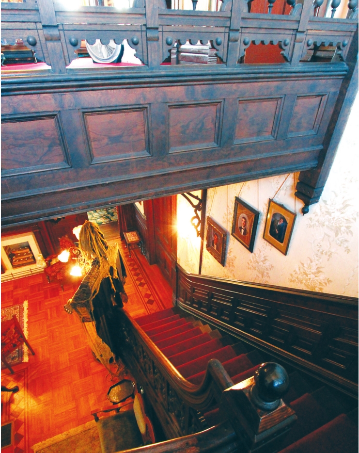 woodwork and fretwork, and the massive mahogany grand staircase are