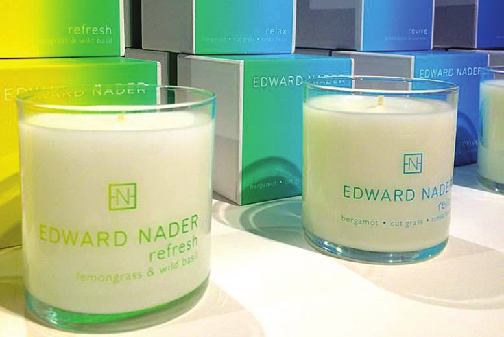 The boxes are a gradation of the spectrum, and the jars are clear with a translucent label,” Nader said. The collection includes Soothe – a combination of pomegranate and sage, Glow – white amber and lily of the valley, Refresh – lemongrass and wild basil, Relax – bergamot, cut grass and Tonka bean, Revive – green apple and lavender, Cleanse – eucalyptus and lavender and Spice – lavender and bergamot.