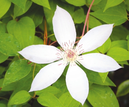 Large metal trellises embellished with large white and purple Clematis burst open almost like a starburst.