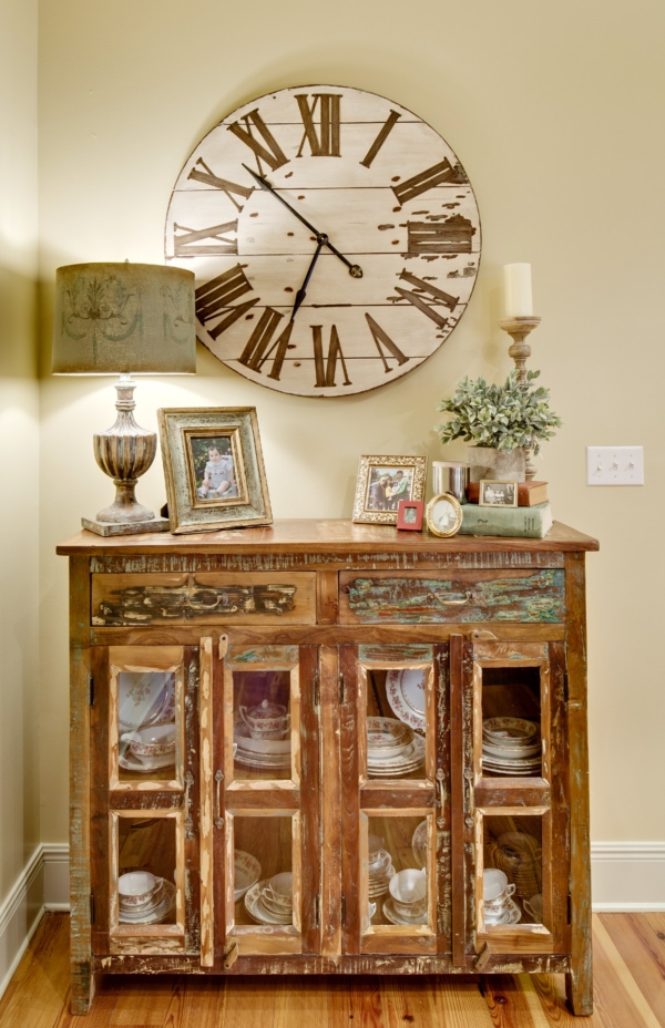 An oversized distressed wooden wall clock is nearby a glass and reclaimed wood display cabinet proudly showing Marshall’s family china.