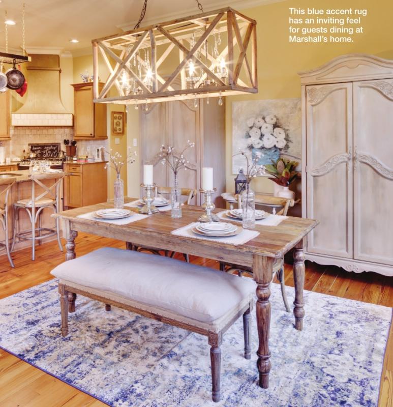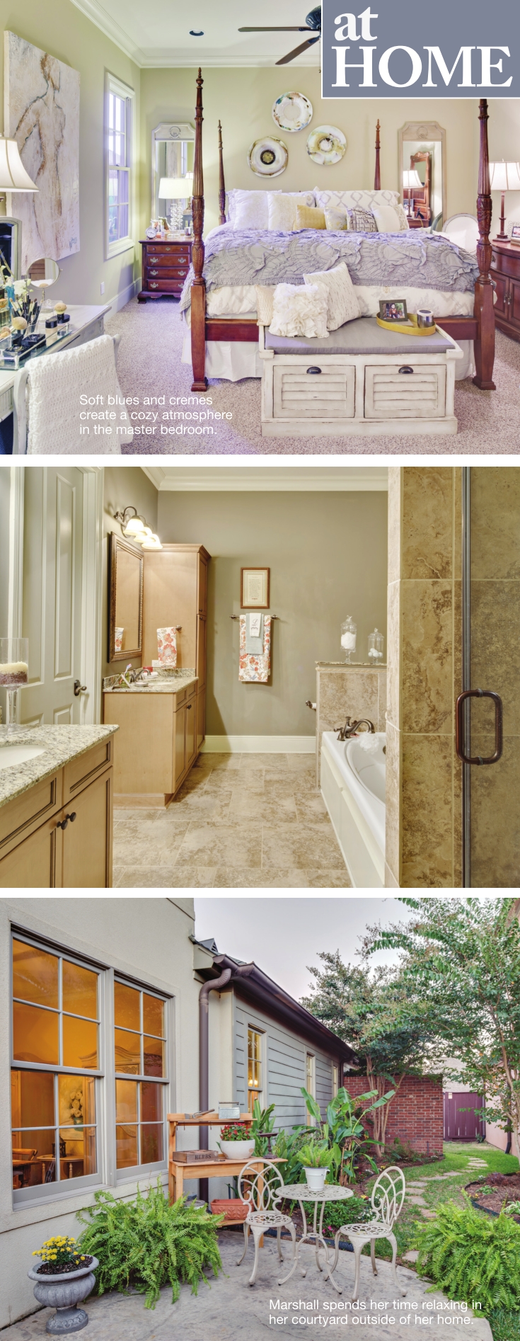 Marshall partnered with Ivy and Stone’s Dana Smyth and Brandi Smyth Sharkey to create a relaxing atmosphere. “I just love coming home and being in my sweet home, whether it’s in my kitchen, relaxing in the living room, working upstairs in my office or enjoying the evening in the courtyard,” Marshall said.