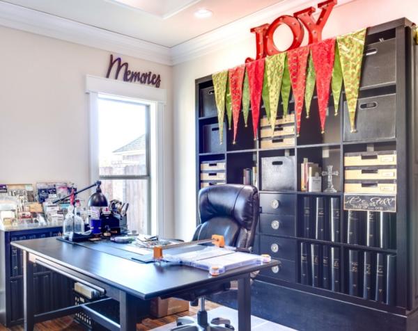 The office contains plenty of shelving and storage options to house supplies.
