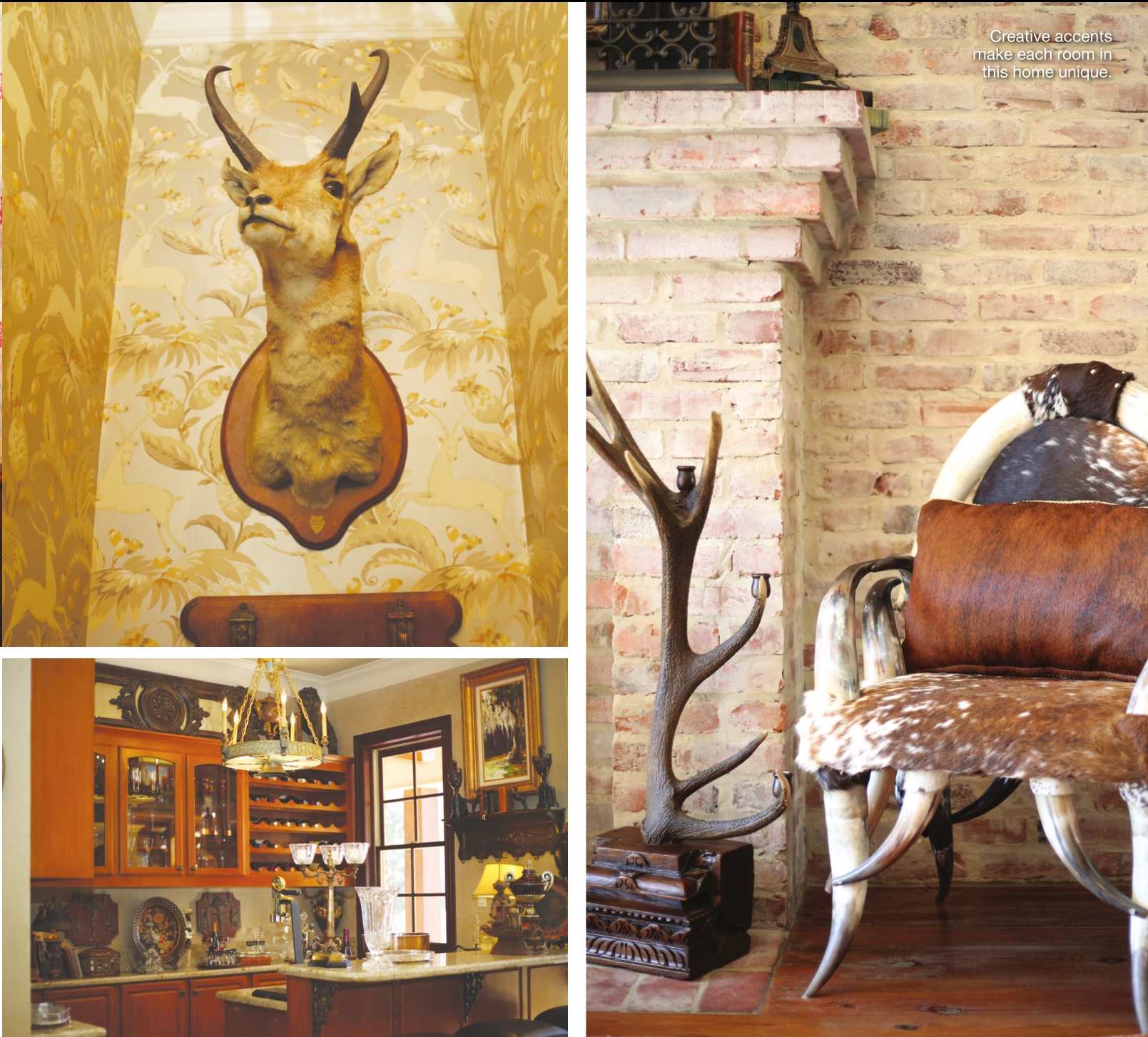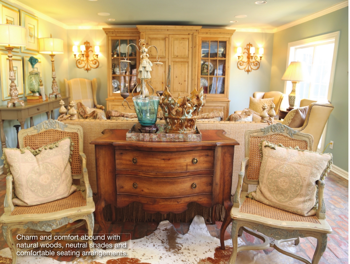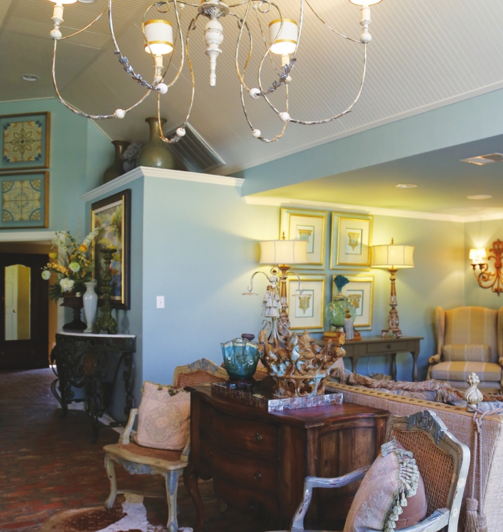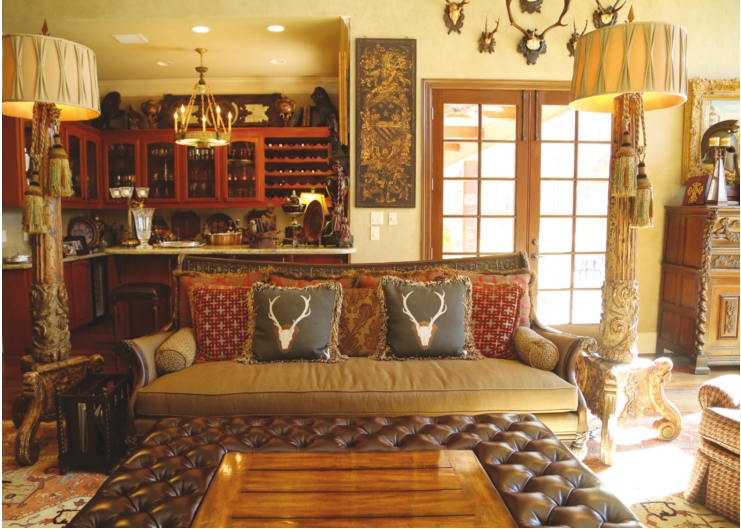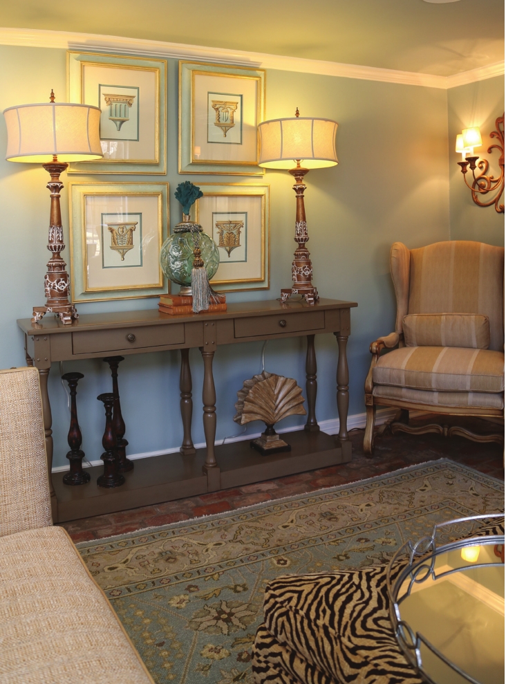 chairs, while Italian hand-carved sconces and Mediterranean prints are