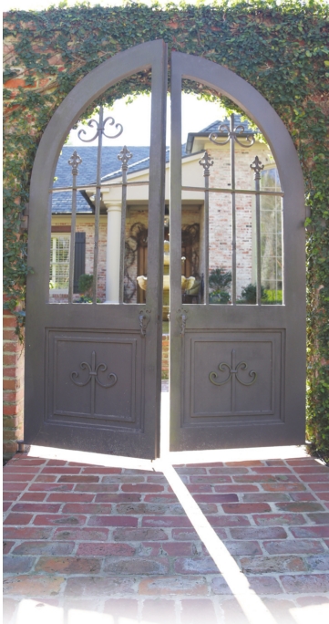 with ivy. A bricked walkway leads into a courtyard and continues up a