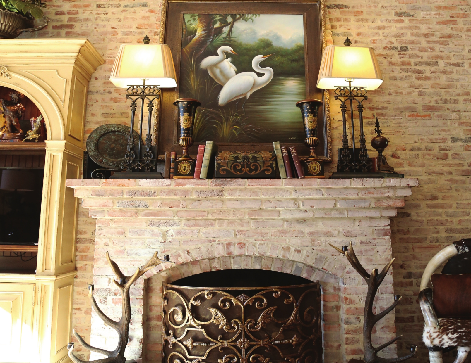 fountain stands in a corner. The room’s original fireplace had a mantel