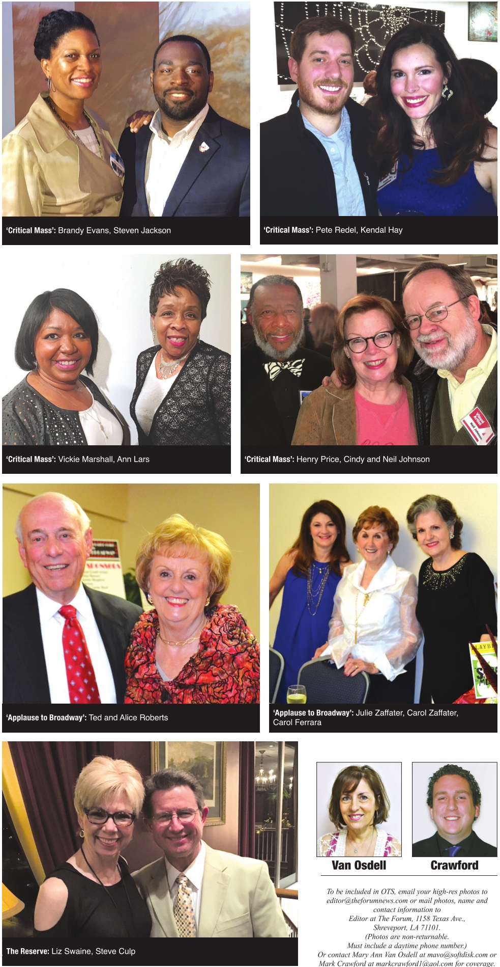 ‘Applause to Broadway’: The Shreveport Little Theatre Guild hosted a fundraiser March 4 at East Ridge Country Club. The gala, “Applause to Broadway,” featured a seated dinner and auctions. Entertainment was provided by Rocky Maddox and Seva May. Sue Wyche is Guild president, and Roxanne Bosserman was gala chair. Table centerpieces featured a top hat with fl owers and a Playbill cover.