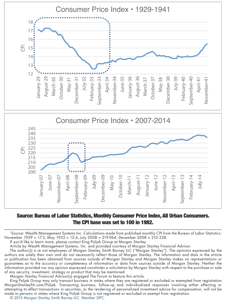 Maintaining stable prices is one of the three pillars of US monetary policy. Although commonly associated with inflation, price stability also seeks to manage lowflation, or worse deflation, which is just as disruptive to a growing economy. Measuring the Impact of Falling Prices The US economy had two periods of sustained price declines in the past 100 years. From late 1929 to early 1933, prices fell at an annualized rate of 8.7 percent. From the middle to the end of 2008, prices fell at an annualized rate of 10.3 percent. 1 These price declines marked two severe economic contractions, the Great Depression of the 1930s and the Great Recession of 2008-2009.