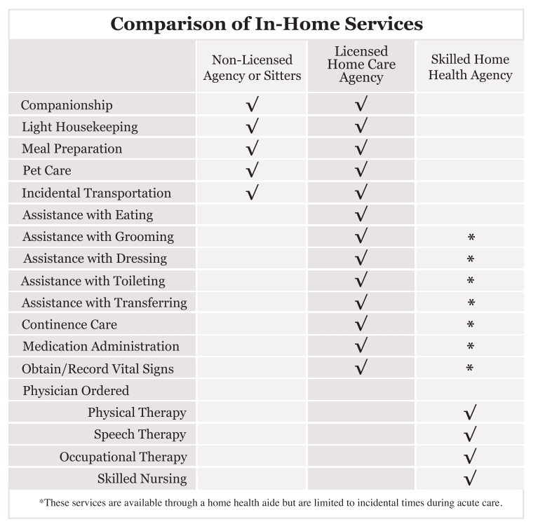 There are three types of inhome care services available to those who need assistance. They include a sitting or companion service business, a licensed home-care agency or a skilled home-health agency. To determine the type of care provider that would be best for your situation, an assessment of needs should occur.