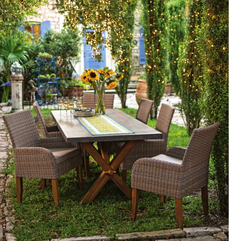 Next, select an area that is convenient and suitable for your outdoor entertaining. Define the space using outdoor rugs and furniture to serve as the walls for your garden room. A bistro set and a couple of chairs make for an intimate space on a balcony. Those with more room may want to include an outdoor wicker and teak dining set. Fill the planters with ornamental grasses, papyrus, cannas and other flowering plants to create a living screen.