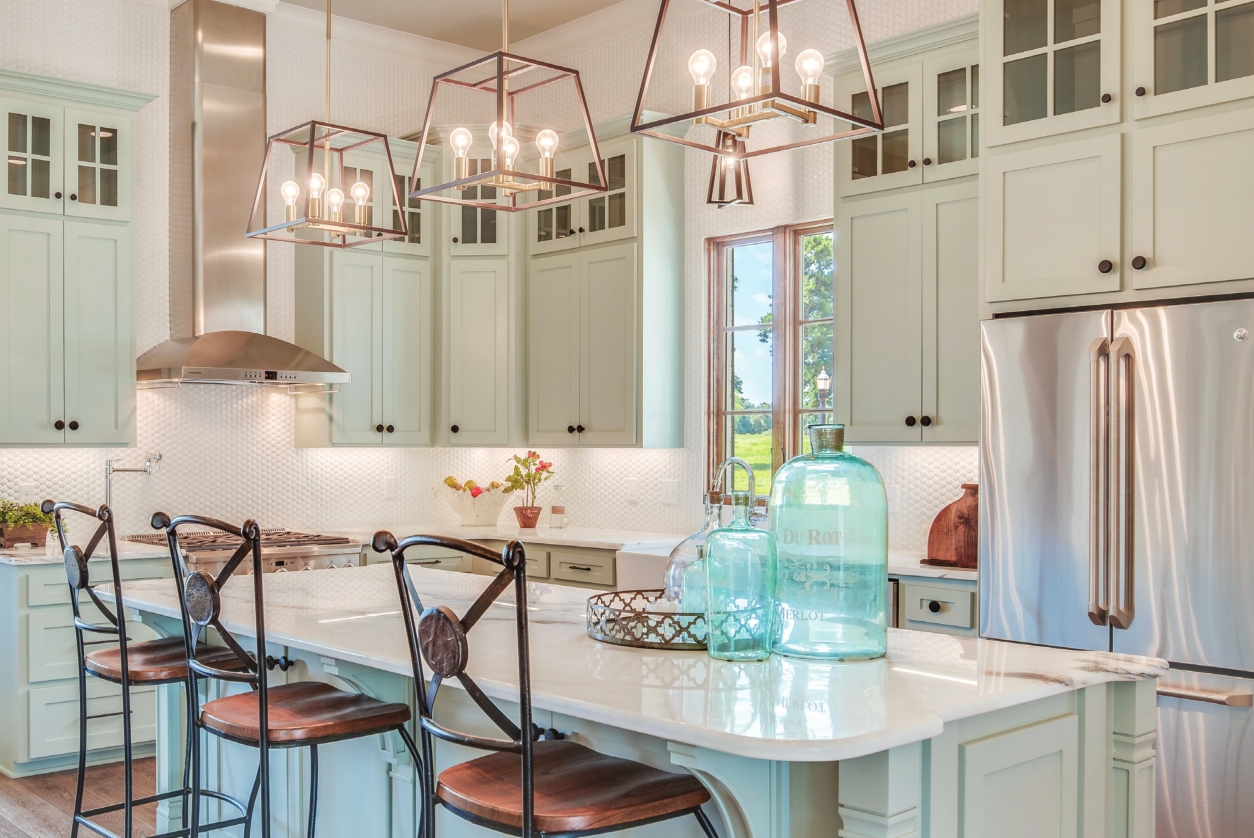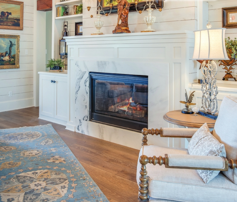 A white basket weave tile backsplash from Henson Carpet One stretches from the counter to the ceiling. The floors – wood, carpet and tile – and lighting also came from Henson. Builders Custom Cabinets constructed the cabinetry, while the quartz slabs for the countertops and other surfaces in the home – including the living room fireplace surround – came from Louisiana Stone and were installed by Sheppard’s Countertops. The appliances are stainless steel GE Monogram. A pot filler was installed on the countertop near the stove.
