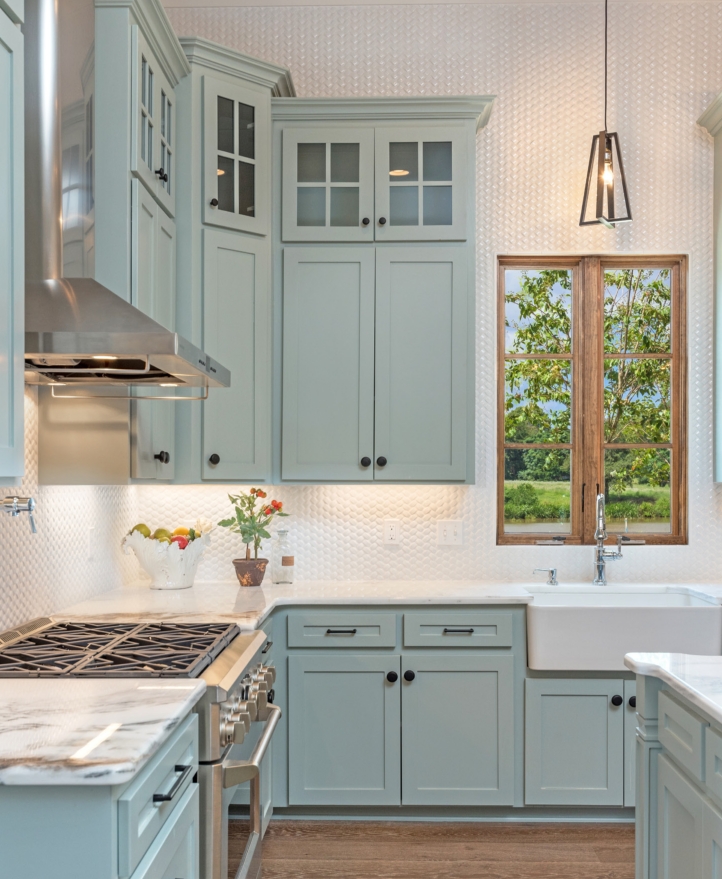He said he chose neutral, white and wood furnishings to make the interior of the home appear large, bright and fresh. Grays, blues, whites were chosen for the walls and cabinetry in the farmhouse-style home.
