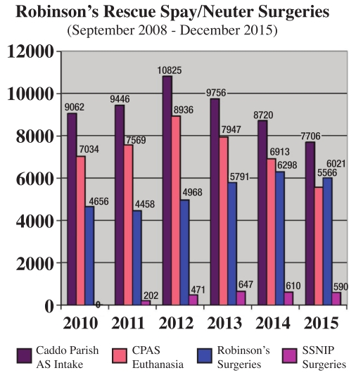 SSNIP is an ongoing program that Robinson’s Rescue has been offering since 2011. It began in Caddo Parish, thanks to a grant from the Caddo Commission and has provided nearly 3,000 free spay/ neuter surgeries to low-income residents of Caddo. The program has recently expanded to include Bossier, DeSoto, Natchitoches, Sabine and Webster parishes. In addition, thanks to funding from the DeSoto Parish Police Jury, Robinson’s Rescue has created a SSNIP DeSoto program specifically for low-income residents of DeSoto Parish in need of spay/neuter services.