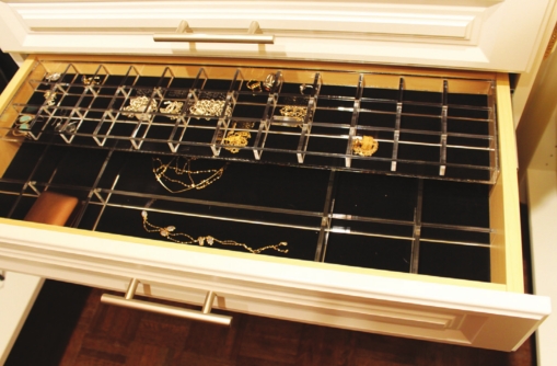 JEWELRY Whether glittering diamonds, vintage costume jewelry, or your kiddo’s finest macaroni necklace, jewelry should be cherished and preserved. I have several special options when it comes to keeping jewelry safe, including custom-designed drawers lined with plush velvet, stackable acrylic dividers to keep jewelry organized, or a hook wall to display long necklaces and costume jewelry. I can also add locks to the drawers to ensure that belongings stay right where they belong.