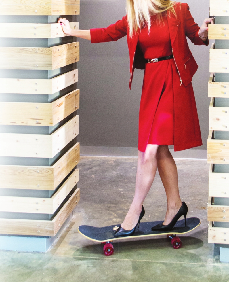 McSwain accomplished that by designing a colorful, open environment, eliminating the ceiling – the piping and HVAC are there for the examining – bright-colored furniture, bright-colored walls and the ability to see outside. That visibility means every desk location on every floor is positioned so the occupant can see out of a window. All the furniture and work stations are mobile, McSwain said; they are intended to be rearranged to encourage collaboration.