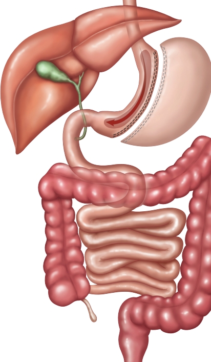 So that leaves us with the two operations that I do perform and recommend. The first is the sleeve gastrectomy. This is a relatively new operation where we remove about 75 percent of the stomach, leaving a long, narrow stomach tube about the size and shape of a small banana. By downsizing the stomach, people fill up much more quickly, and the appetite is decreased. Patients typically lose over half of their excess weight, becoming much healthier in the process.