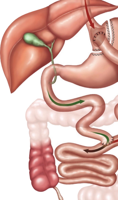 With this operation we create a small stomach pouch, about the size of a large egg, and then bypass the stomach and first part of the intestine. This limits how much food a person can eat at one time, and the food that is eaten is not fully absorbed, so you don't get as many calories out of a given amount of food. Most patients will lose about 70 percent of their excess weight, and it usually cures most of the associated medical problems such as diabetes and high blood pressure.