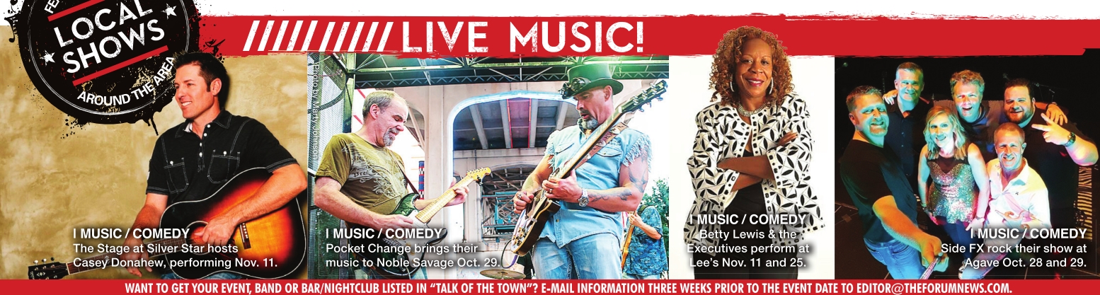 AGAVE: Friday and Saturday night live entertainment 10 p.m. to 1 a.m. Side FX, Oct. 28, 29; Anxious, Nov. 4, 5; Identity Crisis, Nov. 11,12; Bluebirds, Nov. 18, 19; Red Thread, Nov. 25, 26. Happy hour Friday-Sunday, 5-7p.m.: Two-for-one well, wine & draft. No cover. DiamondJacks Casino & Resort, 711 DiamondJacks Blvd., Bossier City. 678-7777.