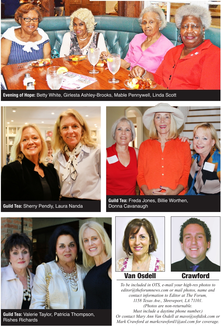 Women from throughout the area attended Community Renewal’s Evening of Hope at Zocolo Eatery to learn more about this year’s House for Hope fund-raiser. The event featured light hors d’oeuvres, fashion courtesy of Le’ Affine Couture and door prizes. Proceeds from the 2016 House for Hope will benefit Community Renewal, Holy Angels, The Hub Ministry and Providence House. – Special to The Forum The beautiful Elston Estate at 6800 Querbes Drive was the scene for this year’s Guild Membership Tea. Three organizations – Shreveport Little Theatre Guild, Shreveport Symphony Guild and Shreveport-Bossier Opera Guild – held their membership drive and social on Sept. 28 at the home of Mary Ann and Terry Elston. Mary Ann Elston and the three Guild presidents, Sue Wyche, Sherry Pendley and Susannah Poljak, welcomed visitors and invited them to enjoy champagne and hors d’oeuvres. Tea, coffee and sweets were also enjoyed. – Photos by Lora Fairchild