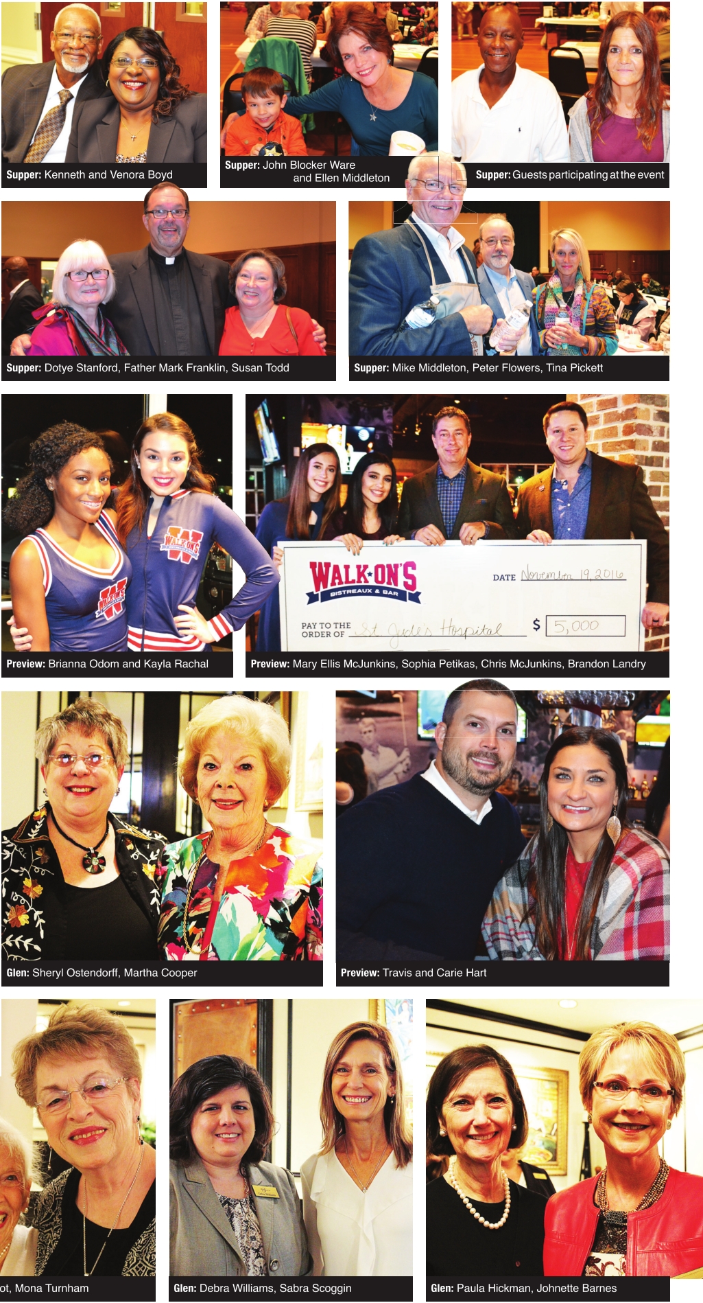 The Poor Man’s Supper held on Nov. 20 benefited the Christian Service Program to provide food and clothing, as well as other services, for the hungry and homeless. The symbolic meal of soup and bread, which signifies what many homeless eat for their supper, was served in the Hunter Activities Building of the First United Methodist Church in Shreveport. Soups came from Monjuni’s and IHOP. – Mary Ann Van Osdell A VIP Preview Night was held at Walk-On’s in Bossier City on Nov. 19. It is located at 3010 Airline Drive. Proceeds from the cash bar benefited St. Jude Children’s Research Hospital. This is the second Walk-On’s in the area, and it is owned by Chris McJunkins. The restaurant features a taste of Louisiana in a game-day atmosphere. – Mary Ann Van Osdell Former and current board members at The Glen Retirement System gathered for a fall luncheon Nov. 16 at Superior’s Steakhouse. The Glen’s CEO and president, Debra Williams, welcomed the ladies and spoke about activities, future plans and opportunities for support in the community. – Special to The Forum