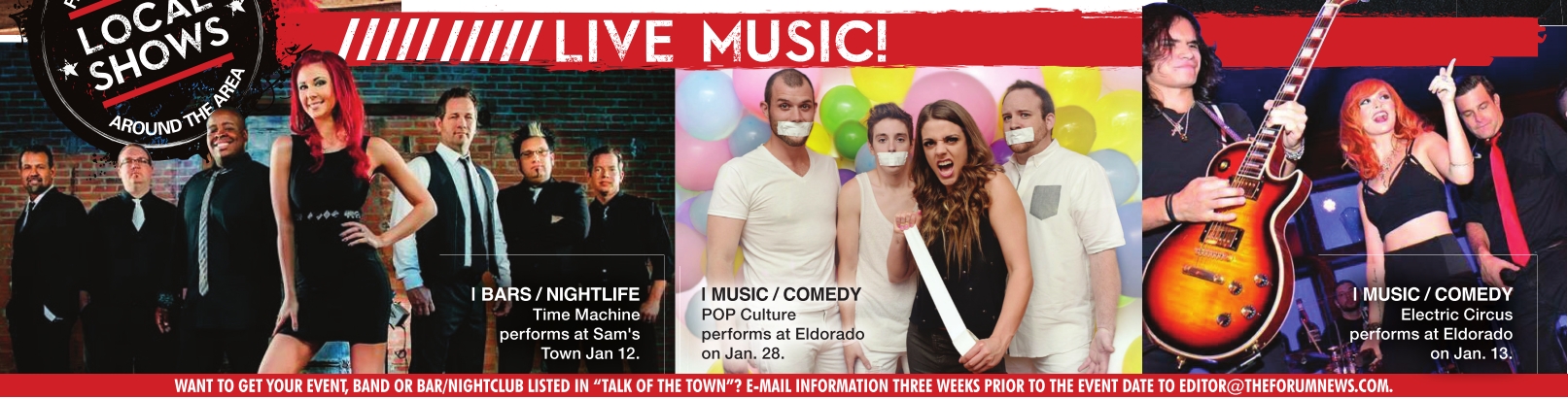 CELEBRITY LOUNGE: What the Funk, 8 p.m., Jan. 4; Betty Lewis and the Executives, 8 p.m., Jan. 4; Windstorm, 10 p.m., Jan. 6; Downtown Fever Band, 10 p.m., Jan. 7; Zebb Rogers Band, 8 p.m., Jan. 11; Electric Circus, 10 p.m., Jan. 13; Shayliff, 8 pm., Jan. 18; Derryl Perry, 8 p.m., Jan. 19; DJ Crush, 10:30 p.m., Jan. 21; Front Cover, 8 p.m., Jan. 25; Party Machine, 10 p.m., Jan. 27; POP Culture, 10 p.m., Jan. 28 Eldorado Resort Casino, 451 Clyde Fant Parkway. Call 877-602-0711.