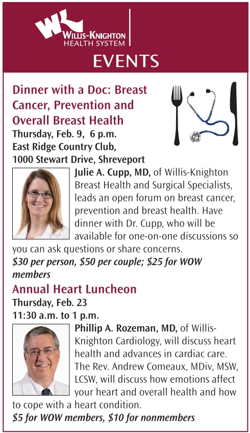Thursday, Feb. 9, 11 a.m. WK Bossier Wellness Center, Cardiac Rehab Education Room, 2450 Hospital Drive Presenters: Rhonda Curtis, RN, cardiac rehab nurse, and Susan Miller, of WomenHeart: The National Coalition of Women with Heart Disease.
