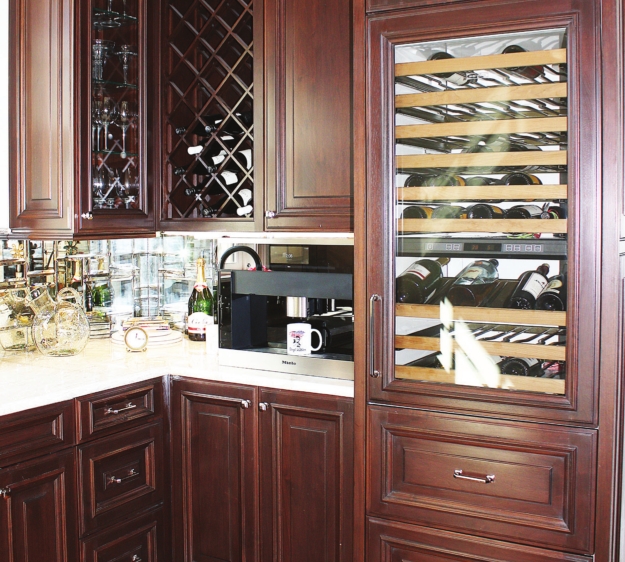 For example, Mary Ann loved the look of the white marble countertops, but decided against using them in the kitchen. “I cook a lot, and we have lots of different groups in our home, like church gatherings and soccer teams and class parties,” Mary Ann said. “I didn’t want to have to stress about kids running around and spills in the kitchen. So instead, I chose quartzite – a natural stone – for most of the countertops.” The finished look was ideal, further highlighting the unique backsplashes and the mirror panel Sub-Zero refrigerator.