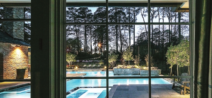 The view of the pool at night from the bedroom is peaceful and relaxing, thanks to the lighting genius of Brandon Bryce with Red River Lighting.