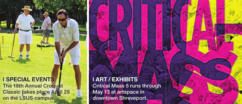 THROUGH MAY 13: CRITICAL MASS 5, This annual invitational exhibition encourages Northwest Louisiana artists to perform, present and/or exhibit one performing and visual artwork for critique by nationally recognized critics and compete for the “Best of Show” recognition with a $2,000 cash award to winners to mount a solo visual exhibition, performance and literary exhibition – in July – to be reviewed by the same critics. artspace, 708 Texas St., Shreveport. Call 673-6535.