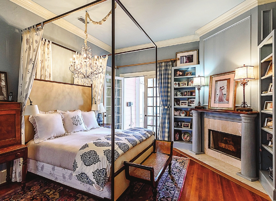 Hand-rubbed, tobacco-stained walls and a rare, cast fireplace mantel adorn the living room. According to Harmon, there are 50 such fireplaces left in the U.S., with only 30-40 in good condition. “They were cast in Chicago in the ’20s. When they rebuilt the house, they had that shipped in.” The couch is a lobby piece out of the historic Hotel Monteleone in New Orleans. Harmon says the best piece they have is a solid walnut antique secretary owned by Harmon’s grandmother. “She bought it around 1920. It was an American antique by that point,” said Harmon. “It really is a museum piece.”