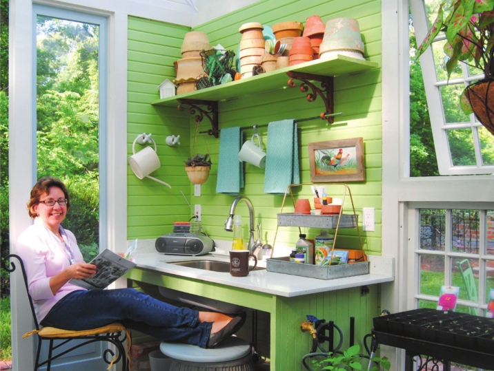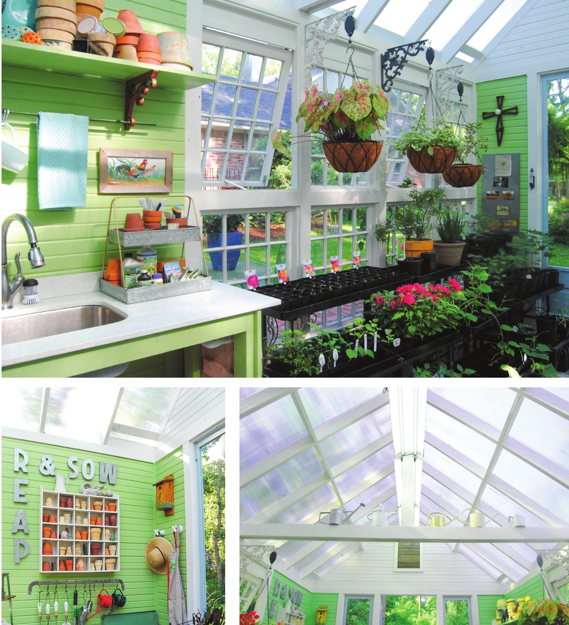 When you get right down to it, however, the greenhouse had to be functional. The Leeths incorporated grow lights and other elements to make the most of the space. Electricity and water plus a good-sized potting sink were must-haves.