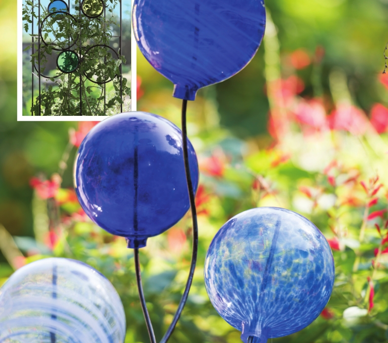 with colorful weatherproof glass inserts. Train peas and pole beans up
